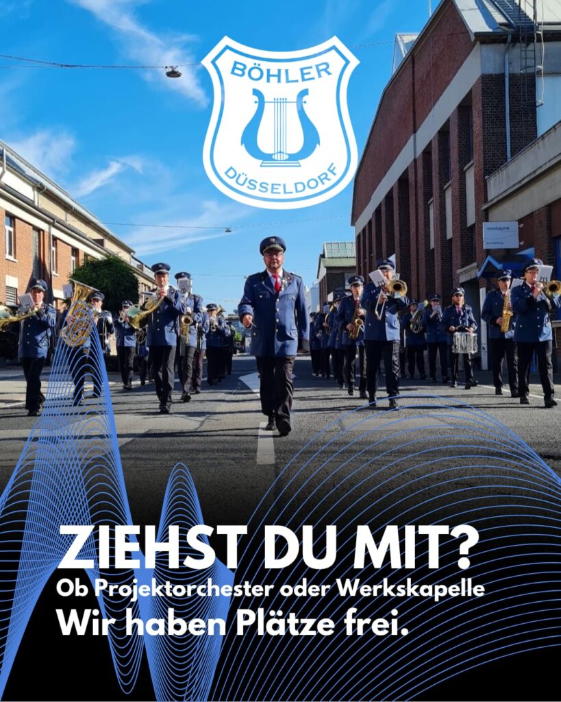Wir öffnen uns auch für Projektmusiker – mit intensiver Probenarbeit und einem klaren Ziel auf der Bühne. Ein Jahr mit dabei sein und Böhler hautnah erleben.